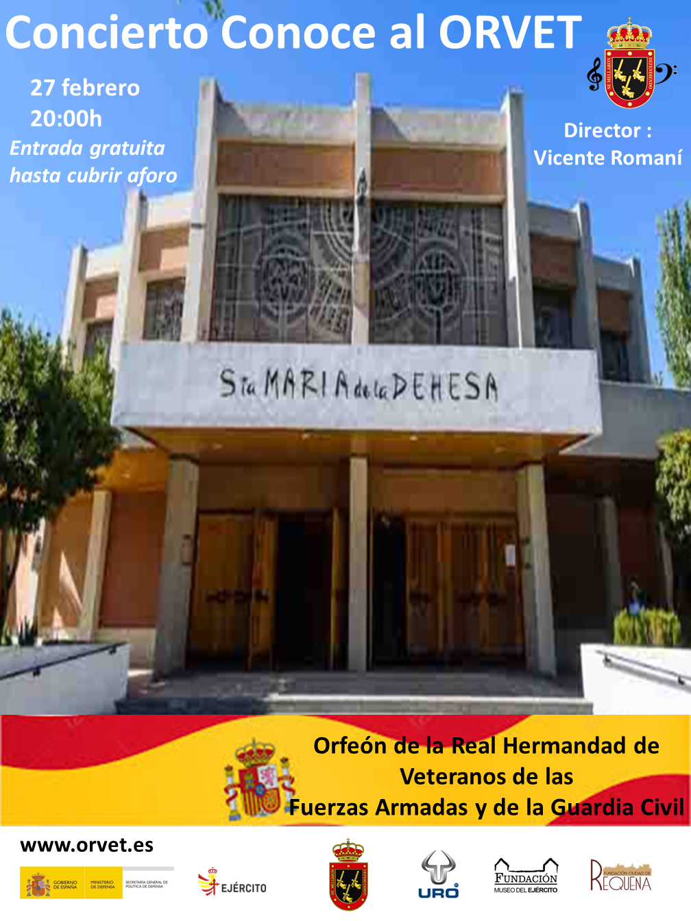 | 27 de febrero de 2026 20:00h | Concierto «Conoce al ORVET» | Parroquia Castrense Santa María de la Dehesa (Av. de Arqueros 19 Madrid) | ORVET | ORVET | ![]() | ![]() | Programa de Mano Completo |
